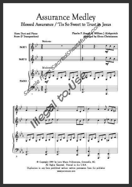 Horn duet with piano accompaniment. A medley of ‘Blessed Assurance’ and ‘Tis So Sweet to Trust in Jesus’ combining two songs telling of the trust in our Savior for salvation and the assurance it brings. Moderate level of difficulty.