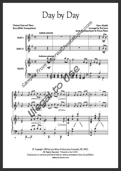 Includes the full transposed score with piano accompaniment and separate duet parts for B-flat Clarinet I and II.
