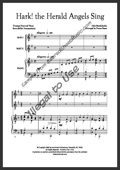 Trumpet duet with piano accompaniment. A beautiful arrangement of this popular Christmas song giving ‘Glory to the newborn King.’ Moderate level of difficulty.