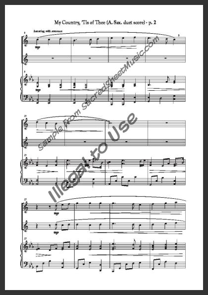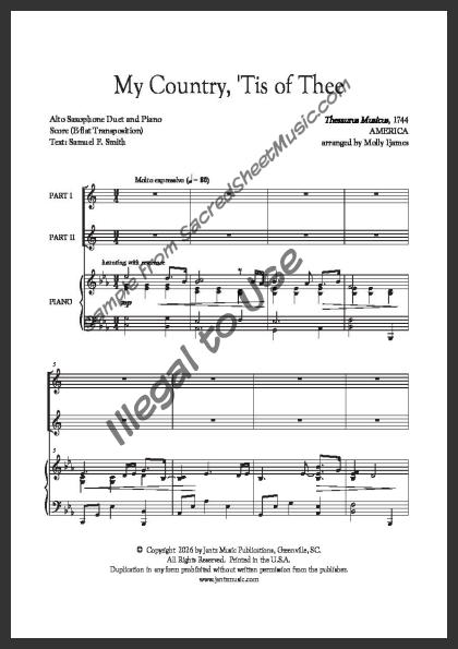 Alto Saxophone duet with piano accompaniment. A powerful, fresh setting of this popular American patriotic song – “America.”. Moderately level of difficulty.