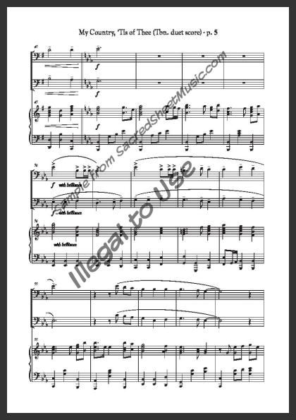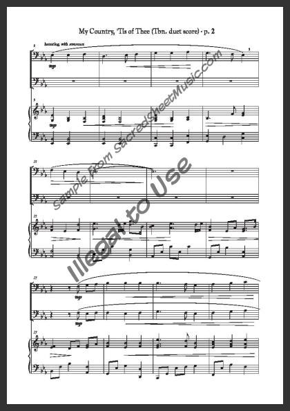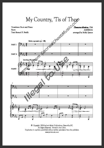 Trombone duet with piano accompaniment. A powerful, fresh setting of this popular American patriotic song – “America.”. Moderately level of difficulty.