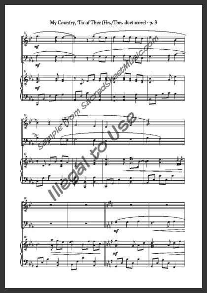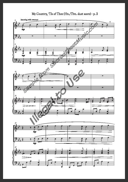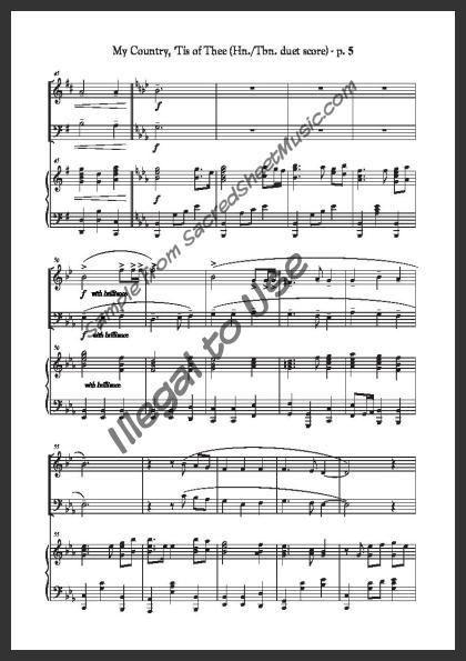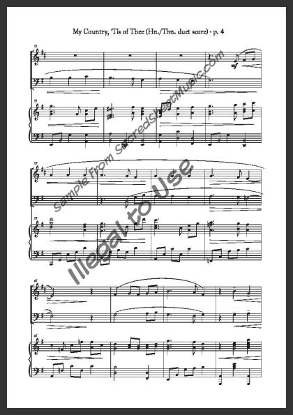 Mixed brass duet with piano accompaniment for horn and trombone. A powerful, fresh setting of this popular American patriotic song – “America.”. Moderately level of difficulty.