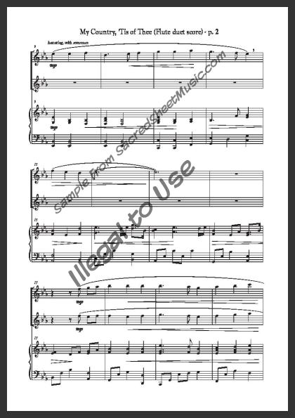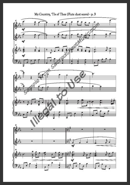 Flute duet with piano accompaniment. A powerful, fresh setting of this popular American patriotic song – “America.”. Moderately level of difficulty.