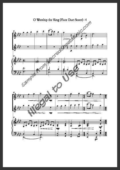 Flute duet with piano accompaniment. A fresh setting of this great hymn inviting us to “worship the King, all glorious above” and “tell of His might … sing of His grace.” Moderately Advanced level of difficulty.