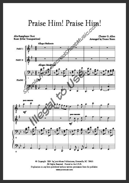 Alto Saxophone duet with piano accompaniment. An uplifting arrangement by well-known arranger Duane Ream of this great hymn of praise – ‘Praise Him! Praise Him! Jesus, our blessed Redeemer!’ Moderate level of difficulty.