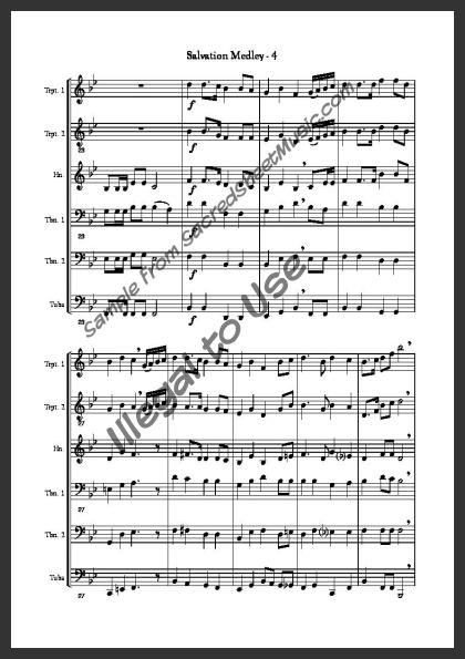 A six-part arrangement for the standard brass sextet instrumentation of two trumpets, horn, two trombones, and tuba. A medley of I Know a Fount and Down at the Cross. Moderate level of difficulty.
