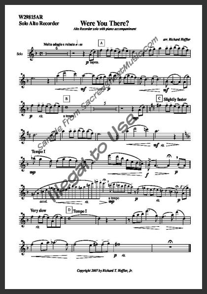 Alto Recorder. A Rich Heffler Music arrangement. This solo is presented in a reverent setting in a minor key. The middle section shifts momentarily to a major mode and then quickly back to a minor mode. The soloist is provided the opportunity to express with a fluid cadenza which gives way to a final statement of harmonic shifts coming to a solemn close.